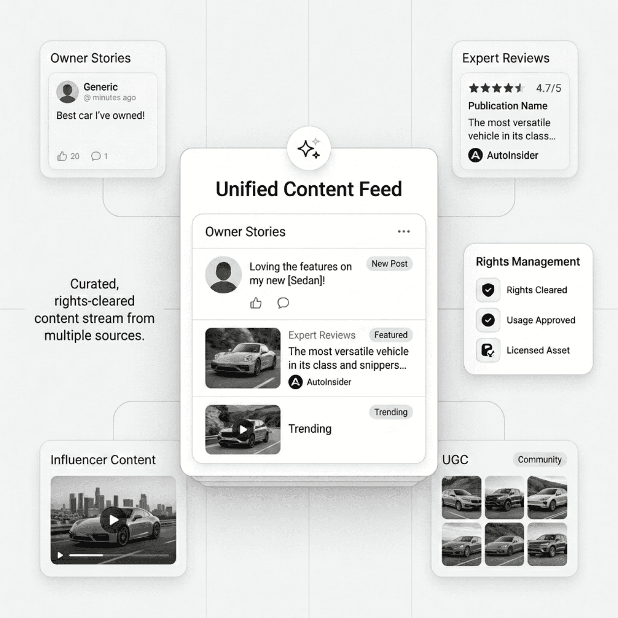 Pull owner stories, expert reviews, influencer content and UGC from every source into one platform.